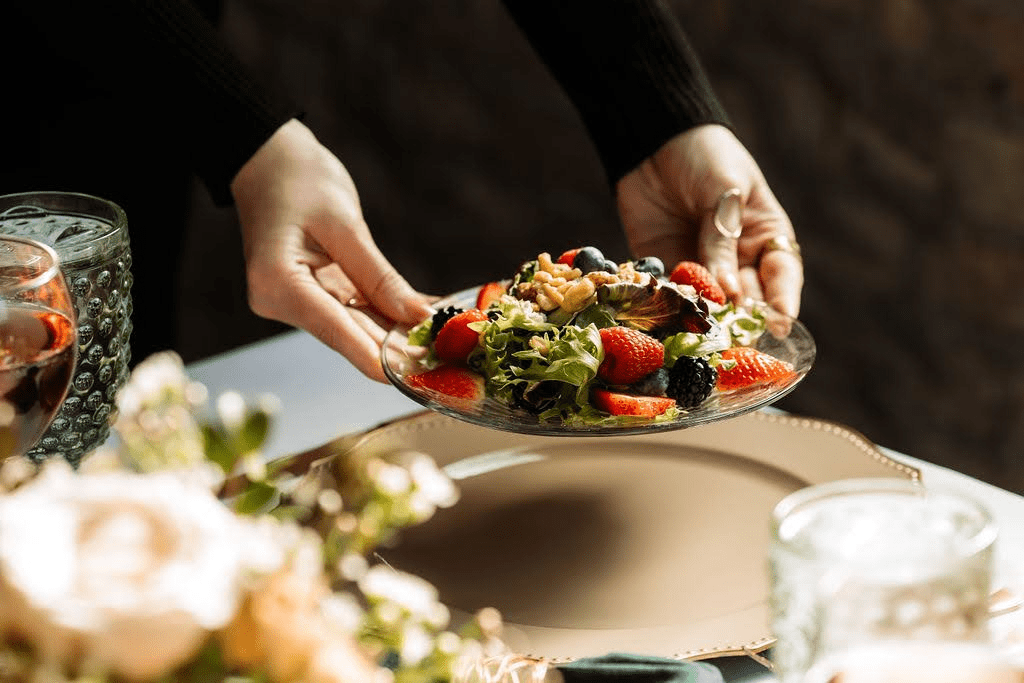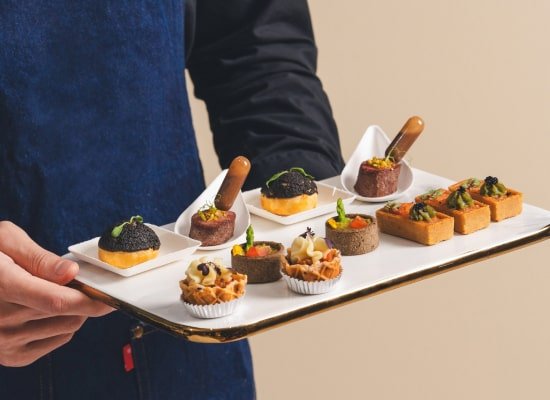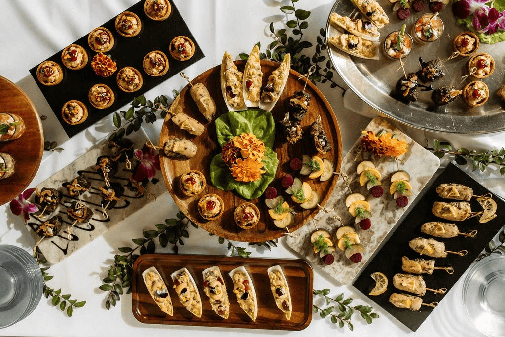 Full-service catering with drinks, canapes, luxury appetizers, waiting staff, and rental materials.
